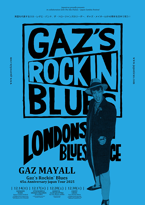 英国を代表するスカ・レゲエバンド、THE TROJANSのリーダーGAZ MAYALL(ギャズ・メイオール)。ブリテッシュ・ブルースの父ジョン・メイオールの長男として生まれ、幼少期から音楽に囲まれて育つ。若かりし頃からジャマイカンミュージック、R&B等のレコードを集め始め、今では世界有数のヴィンテージレコードコレクター/DJになった。GAZがオーガナイズするGaz's Rockin`Bluesはロンドンで最も長く続いているクラブイベントで、今年で45年目を迎える。粋でクラッシックな佇まいとパーティを盛り上げる選曲で人気のGAZ。今回の来日ではTHE SKA FLAMESの40周年記念公演とJAPAN CUMBIA FESTIVALに出演する。都内で開催されるGaz's Rockin`Bluesもお見逃しなく!