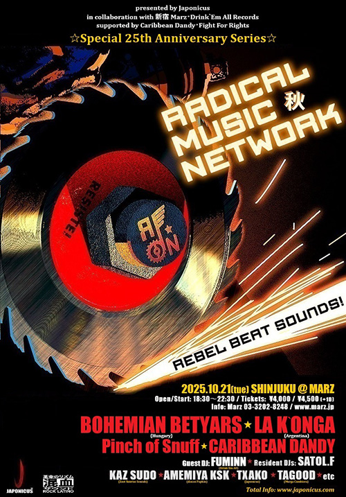 RADICAL MUSIC NETWORKは、東京を拠点に世界で活動している音楽プロダクション、JAPONICUSが始めたレベルミュージックイベント。CARIBBEAN DANDYがレジデントDJを務め、そこに国内外のアーティストが出演するという企画で、東京で定期的に開催している他、沖縄やバスク、フランス、カタルニア、韓国、スペイン、中国、アメリカ等でもイベントやフェスティバルを開催している。RADICAL MUSIC NETWORKのワールドツアーも毎年行っており、2015年・2017年・2018年・2019年のヨーロッパツアーにはFERMIN MUGURUZA、MADJID FAHEM (Manu Chao La Ventura/Radio Bemba)、BRAHMAN、ESNE BELTZA、CARIBBEAN DANDY、TXARANGO、DJ TXAKO、DOCTOR PRATS等が出演している。フジロック内でも4度開催した事があり、クリスタルパレスの入場制限が出るほどの盛り上がりを見せた。そんなRADICALが今年で25周年を迎えるにあたって、春夏秋にアニバーサリーイベントを開催する事が決定。今回の秋の企画にはハンガリーのジプシーパンクバンドBOHEMIAN BETYARS、そしてアルゼンチンからクアルテットの大本命LA K`ONGAが出演する。日本からは東京のクラブシーンを牽引して来たCARIBBEAN DANDYとPinch of Snuffが参戦決定。BOHEMIAN BETYARSとLA K`ONGAとの共演でどんな化学反応が起きるのか?最先端のREBEL MUSIC、MESTIZO (混血)、ROCK LATINO、CUMBIA、PATCHANKA、JUNGLE、GLOBAL BEATS、CLUB MUSICを網羅した、近未来型多国籍REBEL BEAT SOUNDSに要注目!過去にRADICAL MUSIC NETWORKに出演したアーティスト一覧: RICO RODRIGUEZ、NATHEN MAXWELL of FLOGGING MOLLY、THE FISHBONE SOUND CLASH!!、FERMIN MUGURUZA、ANGELO MOORE & THE BRAND NEW STEP、BANDA BASSOTTI、CHE SUDAKA、OBRINT PAS、VERY BE CAREFUL、KING PRAWN (from ASIAN DUB FOUNDATION)、TALCO、DOCTOR PRATS、ZOO、他。