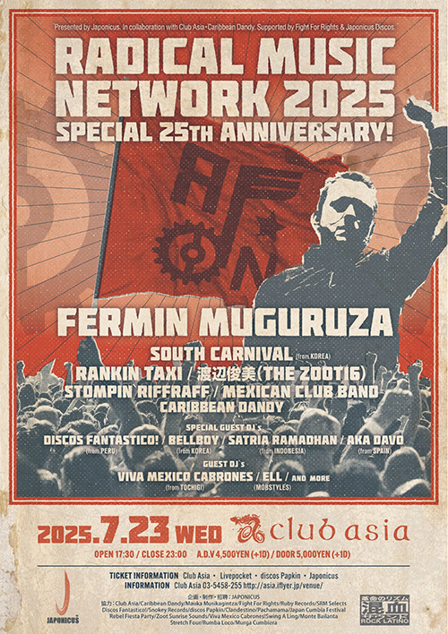 RICO RODRIGUEZ、FERMIN MUGURUZA、BANDA BASSOTTI、BUNNY GANG feat NATHEN MAXWELL of FLOGGING MOLLY、KING PRAWN (from ASIAN DUB FOUNDATION)、DJ SCRATCHY (from THE CLASH)、FIDEL NADAL (from MANO NEGRA & TODOS TUS MUERTOS)、VERY BE CAREFUL、CHE SUDAKA、BRAHMAN、THE 3PEACE、PEALOUT等の伝説的アーティストの出演で話題のRADICAL MUSIC NETWORK。日本にはない新しいREBEL MUSICという音楽の種を植えたいというコンセプトのもと、JAPONICUSが始めた日本のREBEL MUSIC、MESTIZO(混血)音楽の草分け的イベントである。国内のみならず中国、バスク、スペイン、フランス、アメリカ等でも開催。メッセージ性が強く人々に問題提起するイベントとして世界で大きな反響を呼んだ。更に2009年、2013年にはフジロックフェスティバル内でRADICAL MUSIC NETWORKを開催。オーディエンスを熱狂の渦に巻き込み、入場制限が出るほどの盛り上がりを見せた。今回のRADICAL MUSIC NETWORKは「Special 25th Anniversary」記念スペシャルということで、通常以上にREBEL MUSICをはじめとするROCK LATINO・MESTIZO・CUMBIA・REGGAE・SKA・PUNKを楽しめる企画になっている。今年のラインナップは超豪華。フジロックの為に来日するバスクを代表する巨人FERMIN MUGURUZA、韓国からSOUTH CARNIVAL、JレゲエレジェンドのRANKIN TAXI、THE ZOOT 16 (渡辺俊美)、CARIBBEAN DANDY、THE 3PEACEの原広明、STOMPIN’RIFFRAFF等、実力派アーティストの参戦が決まっている。そしてフジロックの出演が決まっている海外からのゲストDJはDISCOS FANTASTICO! (ペルー)、BELLBOY (韓国)、SATRIA RAMADHAN (インドネシア)、Aka DAVO (スペイン) 等の出演決定。今年はREBEL MUSIC、ROCK LATINO、MESTIZOを中心にCUMBIA、SKA、REGGAE、AFRO BEAT、PUNK、GARAGE等、最高に踊れる本物のフィエスタパーティーをお披露目する。25年間支えてくれた皆様に感謝の気持ちを込めて、究極のサプライズと感動をお披露目する!